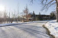 A snow-covered road in a suburban residential area of Ontario. The winter day is marked by freezing temperatures and frost on the trees. Clear sky illuminates the icy infrastructure of the residential homes.
