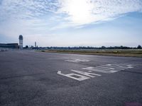 An empty runway in Berlin, Germany, under a clear sky and bright sunshine. The urban landscape surrounds the open space, with trees in the background. A sunny day in the heart of Europe.