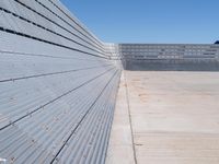 This is an image of a concrete blastwall at an airfield in California, USA. The metal wall is situated under a clear sky, creating a striking contrast. The surface of the wall reflects the daylight, giving it a shiny appearance. This photo represents the infrastructure and security measures at an airport. The blastwall, designed to protect against potential blasts or explosions, is a prominent feature at the airfield. It represents the commitment to safety and security within the aviation industry. The image captures a typical day at an airport in California.