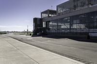 the sidewalk is empty during the day and empty around the corner of it, and the large building with two windows has been moved