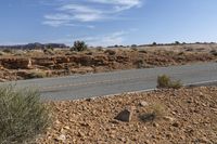 This image captures the beauty of the Utah desert landscape in the USA. The clear sky highlights the contrasting colors of the red rock formations and the grassy vegetation. The asphalt road winds through the terrain, leading towards the breathtaking Canyonlands. With Lake Powell in the distance, this photo showcases the natural wonders of Utah. The road surface indicates a day of clear weather, allowing visitors to explore the magnificent bedrock formations and enjoy the peaceful surroundings. In the sky, contrails can be seen, adding an extra touch of interest to the scene.