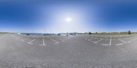 A coastal landscape in Holland, Netherlands. Clear skies reflect on the calm ocean. Boats and sailboats docked at the pier. Three cars drive together on the road, surrounded by open space and vegetation.