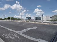 This image captures the modern architecture and urban design of Berlin, Germany. The clear sky and deserted street showcase the city's financial district. The road surface and infrastructure, including the bike lane and light posts, emphasize the city's commitment to urban mobility. The urban landscape is a blend of business buildings, bridges, and city life. This photo offers a glimpse of the bustling energy and modern atmosphere of Berlin's business district.