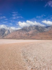 A rugged mountain landscape with a road running through it. The clear sky provides a stunning backdrop. Nature enthusiasts can engage in off-road activities on the gravel and dirt tracks.