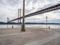 This is an image taken in Lisbon, Portugal featuring a breathtaking coastal view. The photo captures a large red suspension bridge extending over the ocean, creating a picturesque scene. In the foreground, an empty road runs parallel to the beach, leading towards the bridge. The clear sky and calm water reflect the tranquil atmosphere of a sunny day. With the horizon in the distance and the abundance of open space, this photo shows the beauty and serenity of Lisbon's coastal landscape.