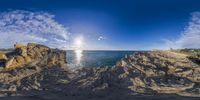 a panoramic view of the ocean with rocks and sand surrounding it and a cloudy sky
