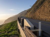 Scenic view of a highway with grass and shrubs along it on the hillside next to an ocean view in California, USA. The road made of asphalt stretches through a stunning landscape with mountains in the background. This picturesque scene captures the beauty of nature, as the sun rises over the coast, illuminating the clear sky with contrails. The road is well-maintained with a concrete bridge, guard rail, and Armco barrier, providing a safe thoroughfare through the mountain pass. The rock wall and slope add a touch of ruggedness to the scenery, creating a striking contrast. A perfect image to depict the scenic beauty of California and the coastal highway.