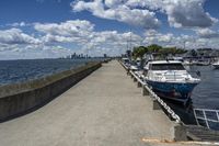 Boats docked at the pier in Toronto, Ontario. A concrete jetty extends into the calm waters of Lake Ontario. The cityscape fades into the distance, creating a scenic coastal view.