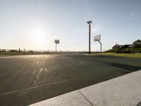 Coastal basketball court in Portugal, featuring asphalt surface adjacent to the beach. Clear sky above, with dawn light illuminating the serene landscape. Ocean views highlight the European coastal sporting culture.