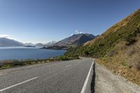 a country road with a scenic view of the lake and mountains in new zealand under a clear, cloudless sky