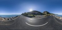 A coastal road in New Zealand, stretching straight ahead with a mountain and water in the background. The fish-eye perspective captures the vastness of the ocean and the serene beauty of the landscape.