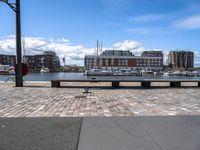 Cobblestone road in Bremen's historic harbor, lined with classic architecture and stone steps leading to the jetty. Modern urban design incorporates street lamps and buildings along the horizon.