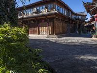A charming and historic neighborhood in Lijiang, China. Cobblestone roads wind through the old town, lined with classic architecture and storefronts. Clear skies provide a picturesque backdrop for this urban oasis in Asia.