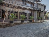 A picturesque scene in Lijiang, China. Cobblestone roads wind through historic architecture, leading to charming residential areas. Clear skies highlight the classic architecture of hotels and restaurants. A delightful day in a tranquil Asian village.