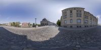 A 360-view of a charming cobblestone street in Berlin, Germany. Classic architecture lines the road with buildings on either side. The historic town square is a tourist attraction, surrounded by landmarks such as the basilica and the Bode Museum.