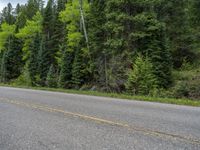 a street leads to a narrow forest with mountains in the background with clouds overhead on an empty mountain road