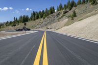 A scenic view of Cottonwood Pass in Colorado, USA. The road, lined with vegetation and framed by clear skies and mountains, leads to Crested Butte. The asphalt road surface winds through the beautiful landscape.