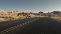 A man rides on the back of a motorcycle down a desert road in Colorado at dawn. The road surface cuts through a mountainous landscape with low brush and rocks. Clear skies above highlight the geology of the area.