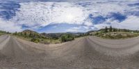 the panorama shot shows a dirt bike on the road at the top of the hill