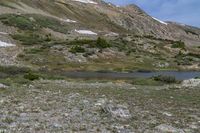 A picturesque lake surrounded by snow-covered mountains in the beautiful alpine landscape of Loveland Pass, Colorado. Green vegetation and rugged terrain add to the natural charm of this open space. Enjoy a day of off-road adventure on the mountain tracks.