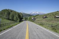 Last Dollar Road in Telluride, Colorado, winds through lush green forests and picturesque mountain landscapes. Clear skies overhead create a perfect day for driving. Straight down the road, the majestic mountain range awaits.