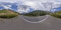 a panorama panoramic view of a mountain range and road with trees and clouds