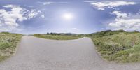a panoramic image of a winding mountain road with mountains in the distance and blue sky