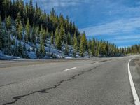 Scenic road in the Colorado mountains, covered in a blanket of snow. Majestic forest and towering trees line the roadside, creating a picturesque winter landscape. Cloudy skies add depth to the scene.