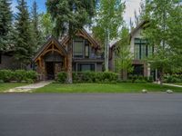 A suburban Colorado road lined with vibrant aspen trees under a clear sky. Residential houses provide a picturesque backdrop. Daytime view of USA's greenery and asphalt pathways.