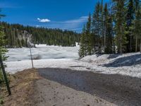 A snowy road in Colorado, surrounded by breathtaking landscape. The open space leads to a picturesque lake. Clouds add a touch of drama to the winter day. Nature in its purest form.