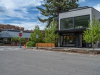 Asphalt road in Colorado suburb, lined with aspen trees and modern architecture. Urban design blends with greenery and residential areas. Cloudy day showcases a mix of city and suburban elements.
