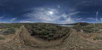 A stunning landscape in Colorado, USA, featuring a picturesque lake surrounded by mountains. Clear blue skies and fluffy clouds overhead. The dirt and gravel surface adds texture and contrast to the scene.