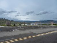 A picturesque landscape in Colorado, USA. The road curves around a serene lake surrounded by mountains. An RV is parked next to the road in a campground. Clear skies and clouds add to the beauty of this nature scene.