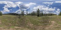 An open space in the Colorado wilderness, surrounded by forest and mountains. A dirt road leads through the rugged landscape, with lodgepole pines and balsam firs lining the path. A serene and natural environment in Antonito, Colorado.