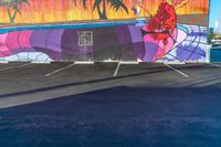 This vibrant and eye-catching mural on a concrete wall in a parking lot in Los Angeles showcases the vibrant street art and urban design of the city. The artwork, painted by a talented artist holding a surfboard, features an array of colors and intricate details. The mural stands out against the asphalt surface, creating a striking contrast. This graffiti wall is located in the city's art district, adding to the vibrant culture and atmosphere of the area. With its hard shadows and bright colors, this mural encapsulates the essence of California's urban and artistic scene.