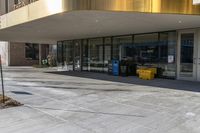 This is a photo of an empty street in Ottawa, Canada. The modern architecture of the office building contrasts with the grey concrete of the road surface. The sidewalk is lined with trash cans near the entrance. The image captures the urban design and infrastructure of the business district. The city life is evident with the lack of traffic and the presence of vegetation along the curb. The photo represents the property and real estate in Ottawa and showcases the clean and organized urban environment.