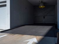 a gray walkway leading up to a building next to a yellow light lantern on top