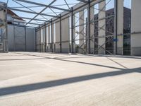 Modern architecture in Berlin. A two-story building with metal frameworks stands tall in the city. The concrete-covered floor adds an industrial touch. Clear sky casts hard shadows on the urban design.