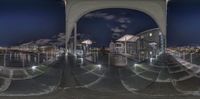 three panoramic images of the buildings at night and a street below them in a mirror