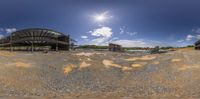 A construction site in progress as an outdoor arena is being remodeled into a sports field. The cloud-filled sky contrasts with the concrete surface and gravel area. Profile view of the dirt and sand surfaces.