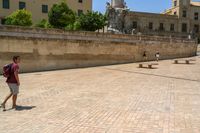A classic architecture museum in Cordoba, Spain. People sit in an open courtyard area, enjoying the clear sky and urban surroundings. The town's clock tower and buildings create a picturesque backdrop.
