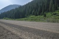 a dirt road near some trees in a mountainside area with evergreen woods and hills