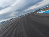 A race track in the USA with asphalt road and curved sections. The track is lined with clouds on a sunny day, perfect for high-speed race and thrilling racing action.