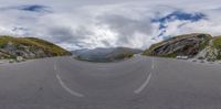 a curved road with mountains and hills in the background on a cloudy day from a fisheye lens