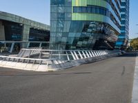 This stock photo features a curved road near a modern office building with large windows and a green and blue facade. The image was taken in the business district of a vibrant city in the Netherlands, capturing the bustling city life and modern architecture of Europe. The road is made of asphalt, symbolizing the urban environment. The image perfectly represents the combination of business, architecture, and city life in this European city.