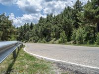 A curvy road in the Pyrenees, Spain, surrounded by lush greenery and dense forests. The Armco barrier ensures safety. Clouds hover above the majestic mountains, creating a picturesque European landscape.