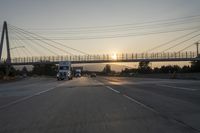 This is a photo of a straight road leading towards a bridge under a clear sky at dawn. The asphalt road surface and motion blur indicate the transportation activity on the highway. The bridge is identified as an extradosed bridge, with its unique design featuring suspension cables. The sun is visible in the photo, casting a warm light on the scene. This image captures the peacefulness and beauty of the break of day, as the sun rises and shines down on the road and bridge.