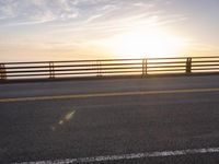 A scenic coastal road in California at dawn. The road stretches along the coastline, with the clear sky and sunshine casting a beautiful light on the ocean. The horizon is dotted with contrails, adding to the picturesque landscape.