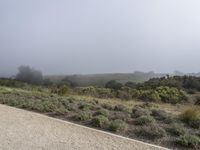A serene and misty California dawn breaks over a rural landscape. Vegetation thrives in the foggy and rugged terrain. The grey sky casts a gloomy veil over the vineyards and chaparral valleys of Monterey.