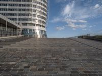 This is an image of a clear sky over the city of Bremen, Germany. The photo captures the modern architecture and urban design of the city, with tall buildings and condominium towers. The road surface, made of cobblestone, leads straight down the road towards the city center. In the foreground, there is a hotel with windows reflecting the dawn light. This image represents the vibrant city life of Bremen and showcases the mix of historical and modern elements in the city's architecture and urban landscape.